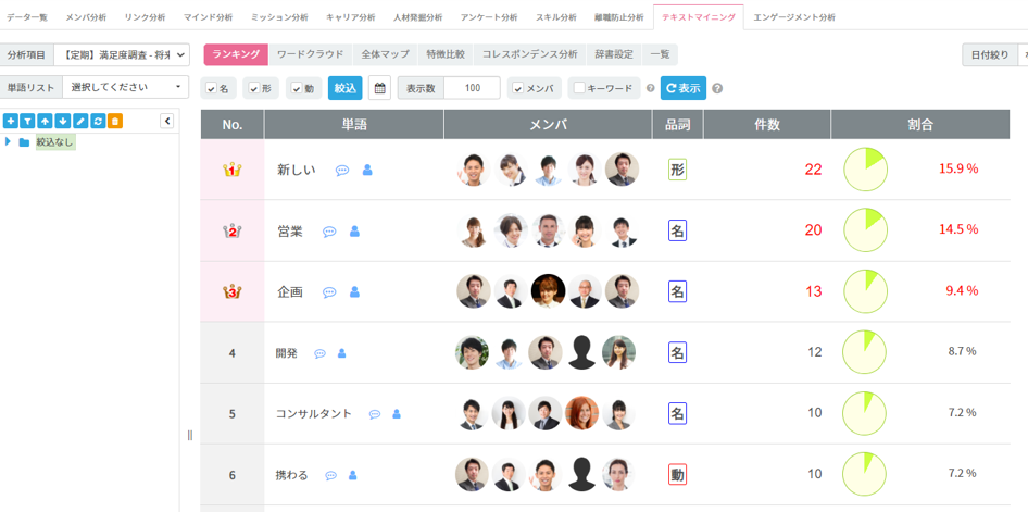 『新しい』『営業』という言葉が多く使われていることが分かり、社員の興味のある範囲を絞り込むことが出来ます。
