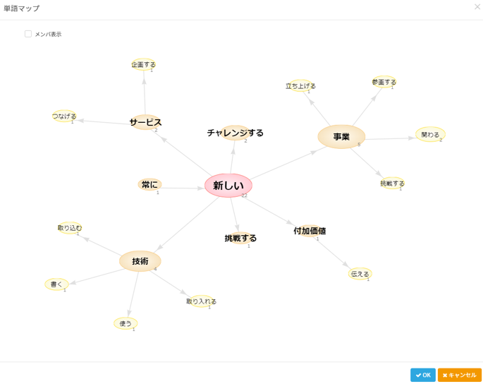 もちろん単語を閲覧するだけではなく、クリックすれば単語マップという単語間の流れも確認することが可能です。例えば中心の『新しい』という単語から右上の『事業』という言葉へ繋がっていることが分かります。