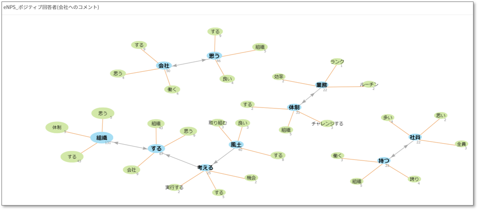 例えば、「変革意欲を醸成したい」といった課題があれば、テキストマイニングの全体マップ(共起ネットワーク図)から「チャレンジ」という単語をピックアップします。ここではeNPSがポジティブな対象者が「チャレンジ」について語っているため、エンゲージメントが高い社員をよりチャレンジさせるためにどのようなことをしたいかを語っている文章になります。
