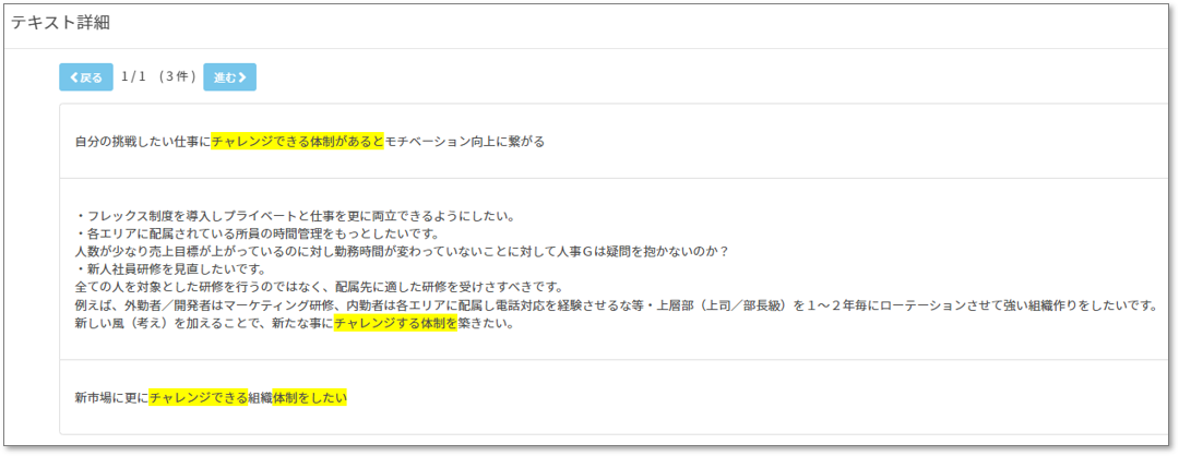 内容を確認すると、新しい仕事やローテーション、新市場への挑戦という単語が抽出されるので、チャレンジ施策の具体化に活用していきます。