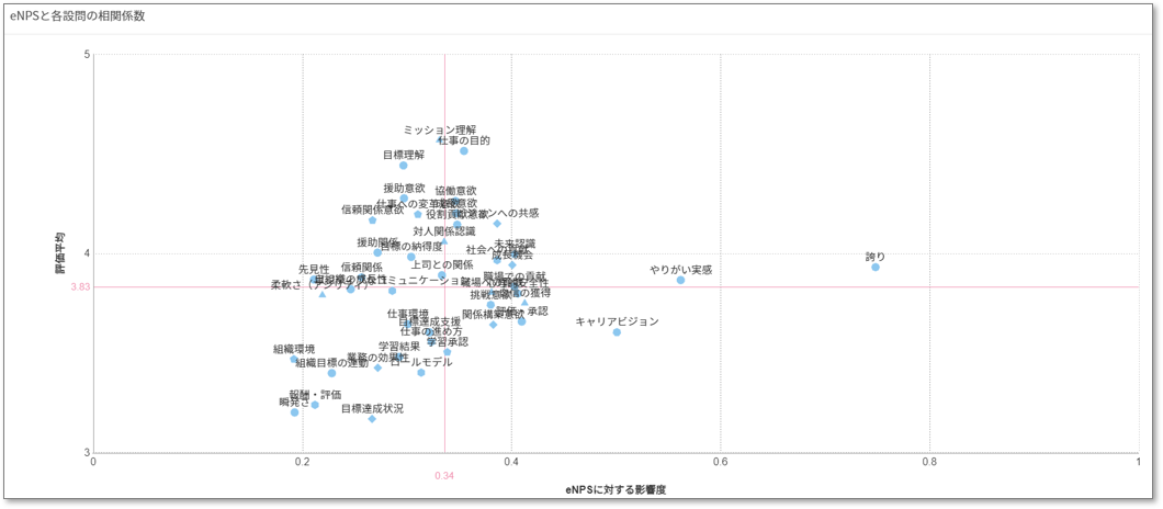 上記の例での課題抽出ですが、eNPSを目的変数にしているため、誇りややりがい実感の相関係数が高いのですが、この設問は施策検討に使用しづらいため、実際の検討の際には除外して考えます。一方、キャリアビジョンは施策検討もイメージしやすく、eNPS向上に向けてこのテーマを深掘りするというのが課題抽出のプロセスになります。