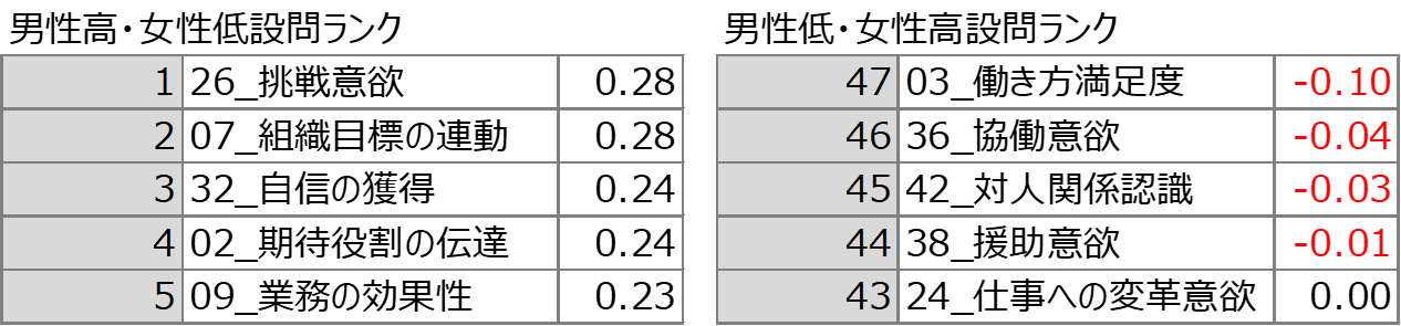 下記の例では、男女の点数差の大きい設問の差を並べると、女性は男性に比べて、挑戦意欲があるか、組織と個人目標が連動しているか、自身をもって仕事を進めているか、期待役割を明確に伝えられているかといった、エンパワーに関する設問の傾向差が出てきます。